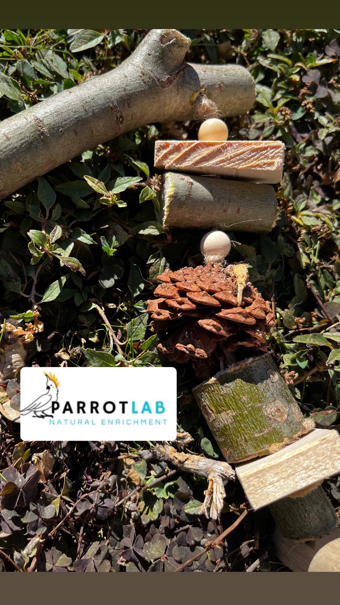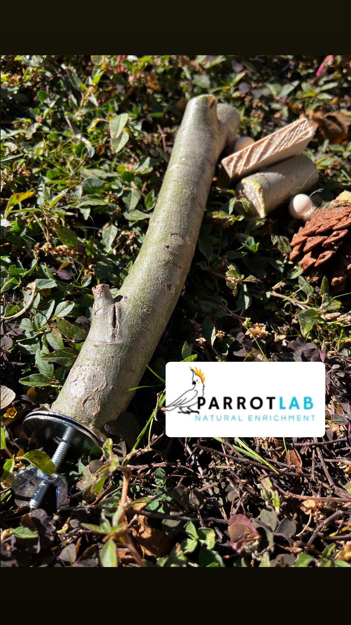 Trespolo in eucalipto adatto per piccoli pappagalli con gioco integrato.